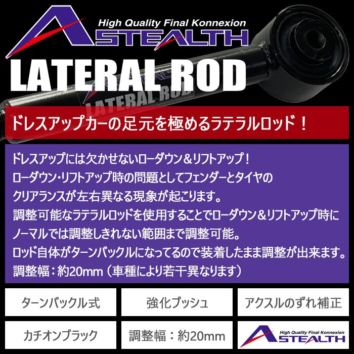 調整可能なラテラルロッドを使用することでローダウン時にノーマルでは調整しきれない範囲まで調整可能。