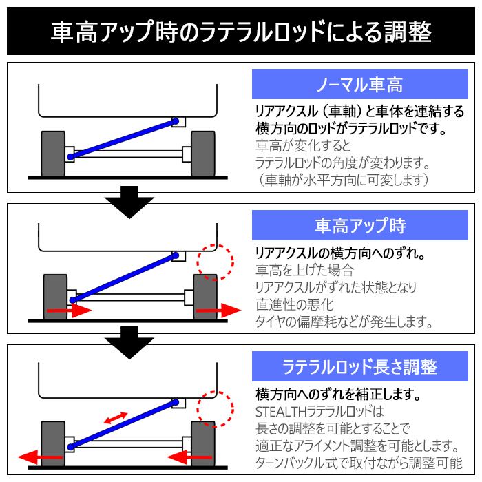 調整可能なラテラルロッドを使用することでローダウン時にノーマルでは調整しきれない範囲まで調整可能。